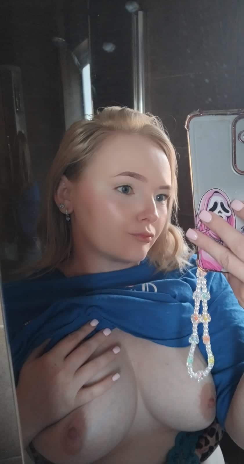 A curvy blonde woman flashes her large breasts in a bathroom mirror selfie, wearing a blue t-shirt pulled up and leopard-print lingerie. Her confident pose a…