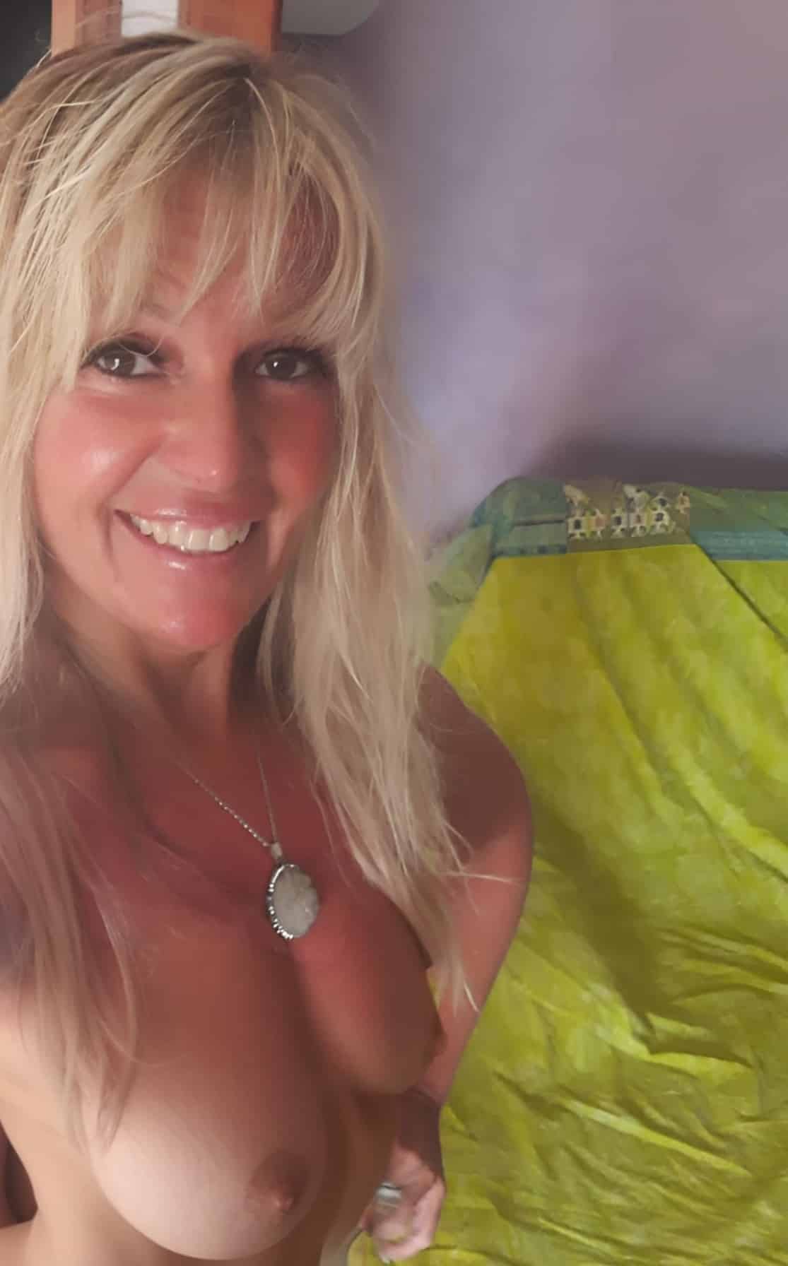 Her skin, soft and pale, glows under the warm light. The texture of her flesh is inviting, with a gentle roll to her curves. She's lying on a fuzzy brown blanket, her body relaxed yet suggestive. Her thick thighs are slightly spread, and her hips are accentuated by the white striped thong pulled down just enough to tease. Her breasts, medium-sized and naturally shaped, rest heavily on her chest, nipples a soft pink. The thong covers her pussy, but the curve of her ass is tantalizingly visible, round and full. Her hair, shoulder-length and brown, falls messily over her face, hiding her expression but adding to the allure.