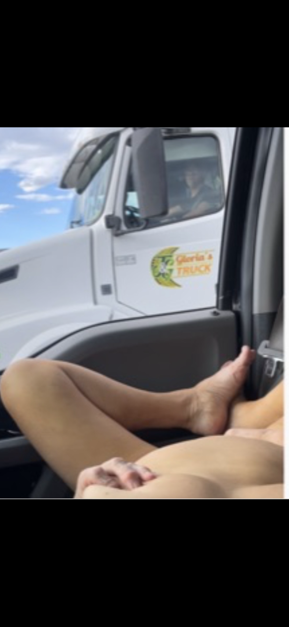 The truck, a symbol of long journeys and endless roads, becomes a stage for a different kind of adventure. The legs, bare and unapologetic, tell a story of freedom and desire. The trucker, unseen but present, is part of this narrative, a silent participant in the unfolding scene. The open door, the blue sky, and the clouds create a backdrop that is both mundane and extraordinary, a contrast that heightens the intimacy of the moment. So, in this truck, on this road, a different kind of journey unfolds. One of desire and discovery, where the open road meets the open heart. The truck, a Gloria a Truck, becomes more than just a vehicle; it's a sanctuary, a place where boundaries blur and desires are laid bare, quite literally.