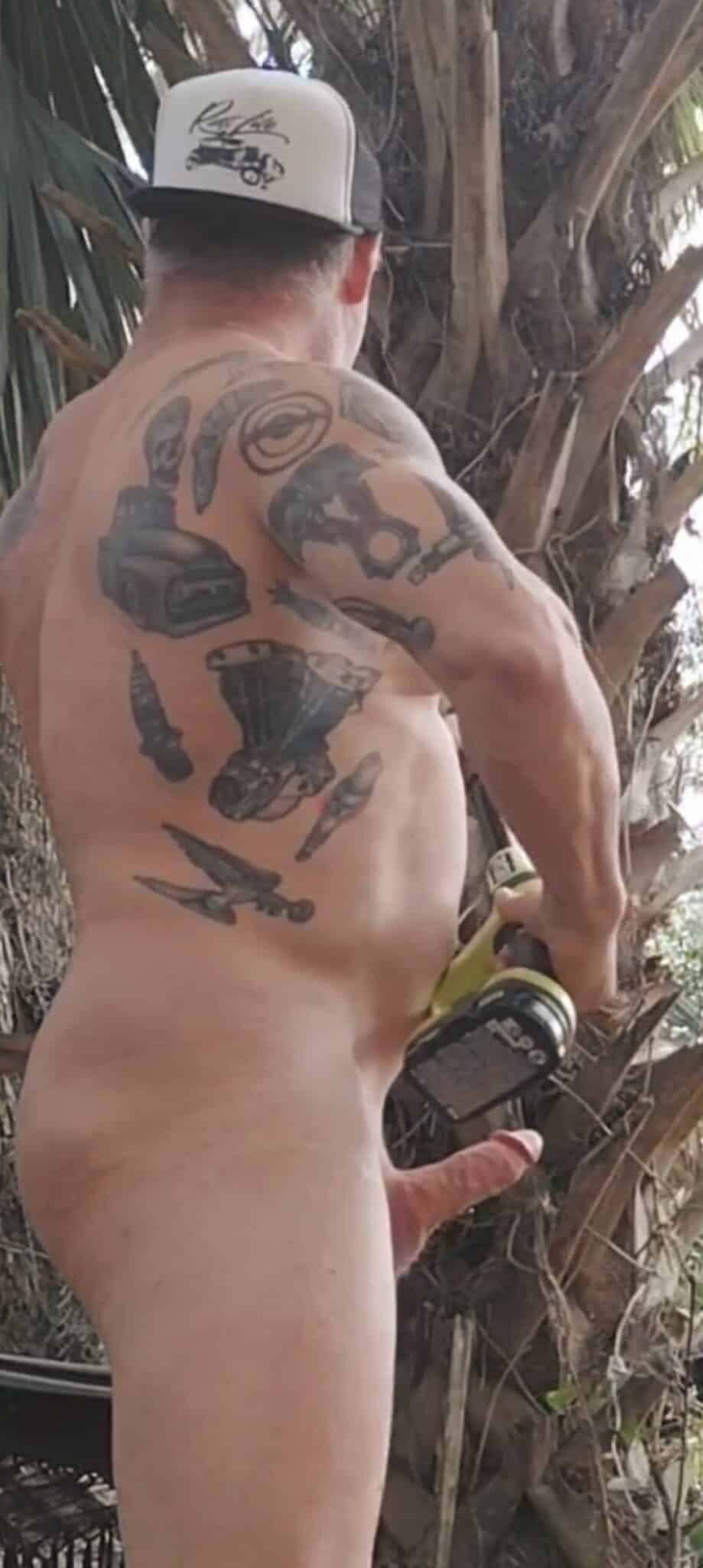 The camera captures a man, partially nude, moving through a yard filled with trees. His muscular build is accentuated by the black camouflage paint that covers significant areas of his body. The paint contrasts sharply with his Caucasian skin tone, highlighting the hairy chest and visible pubic hair. He wears black undergarments and camouflage knee armor on one leg, adding a rugged edge to his appearance. His semi-hard, uncut cock is prominently displayed, a testament to his comfort with his nudity. The man's expression is neutral, his eyes open but looking away from the camera, as if focused on the task at hand. There's a sense of purpose in his movements, a quiet confidence in his nudity amidst the natural surroundings.