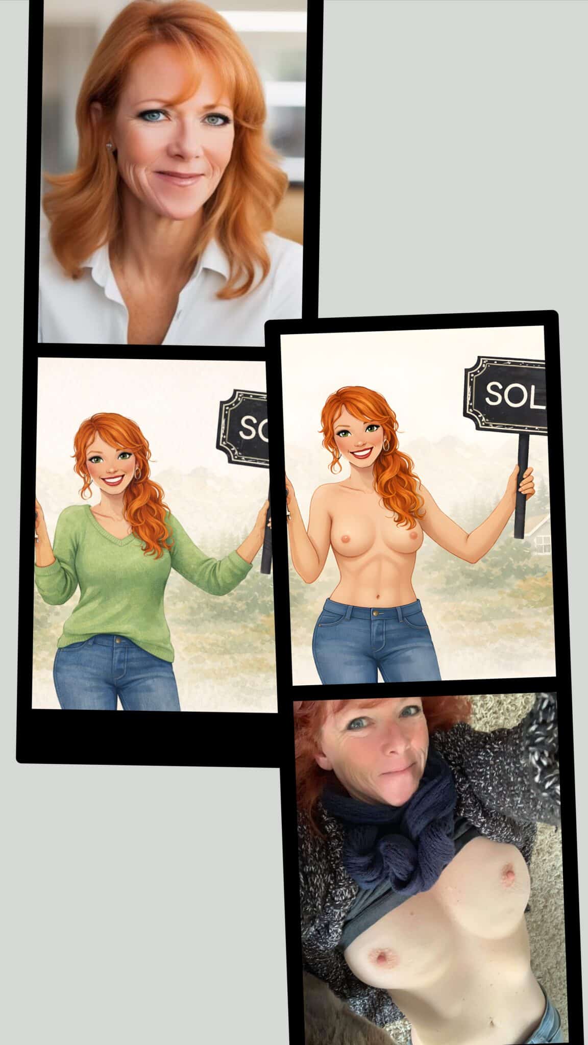 The camera pans across the room, capturing a mix of reality and illustration. In the top photo, a real woman with red shoulder-length wavy hair smiles confidently, her white button-up shirt open at the collar, hinting at the curves beneath. Her eyes sparkle with a mix of professionalism and playfulness. And next to her, an illustrated woman in a green sweater and blue jeans offers a cartoonish grin, her long red hair cascading down. The middle-right panel reveals a topless illustrated woman with visible abs and perky tits, her pink nipples adding a touch of allure. The bottom-right photo shows a real woman with red curly hair, her blue scarf and open sweater revealing medium-sized breasts with erect pink nipples. The