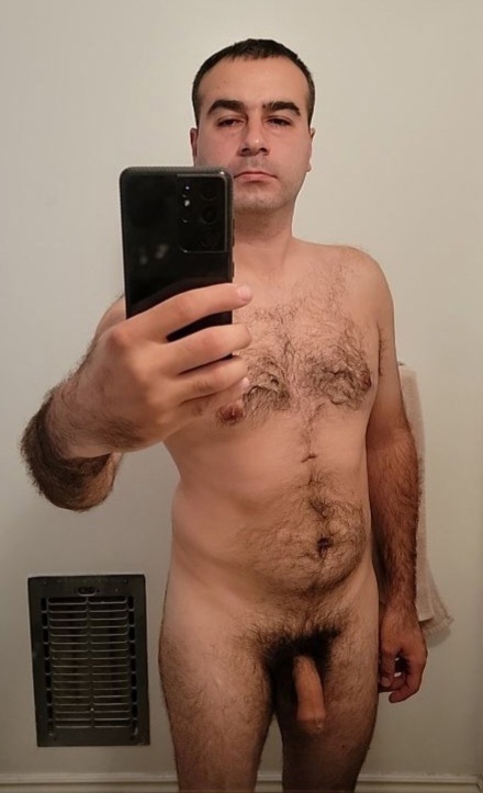 The sound of the vent humming softly fills the room, a mundane backdrop to the stark reality unfolding. Albert Pogosov stands nude, his body hair visible under the neutral lighting, holding a smartphone in his right hand. He's captured in a mirror selfie, his expression neutral, eyes locked onto the camera. The bathroom setting is clear, with the vent on the wall serving as a silent witness to this intimate moment. His cock hangs relaxed, a natural part of the scene, as he stands upright, facing the camera without a hint of modesty. The image captures his entire torso and legs, leaving little to the imagination. It's a raw, unfiltered glimpse into a private moment, now exposed for all to see.